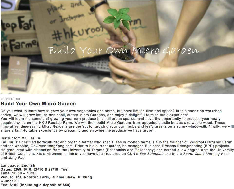 HKU New College Hall. Urban Farming and Sustainability Workshop Series. Fall 2016.